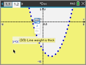 If you are not seeing the dotted line for the parabola, it may be that your thickness level of the parabola is set at "thin" and it is blending in with the shading. You can either change the color of the parabola, or change the thickness of the parabola.