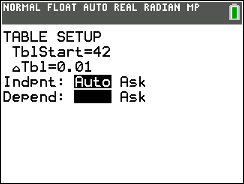 Go to TBLSET (above WINDOW) and set the TblStart to 42 (since 42 minutes gives a temperature close to 106º in our chart).  Set the delta Tbl to a decimal setting of your choice.